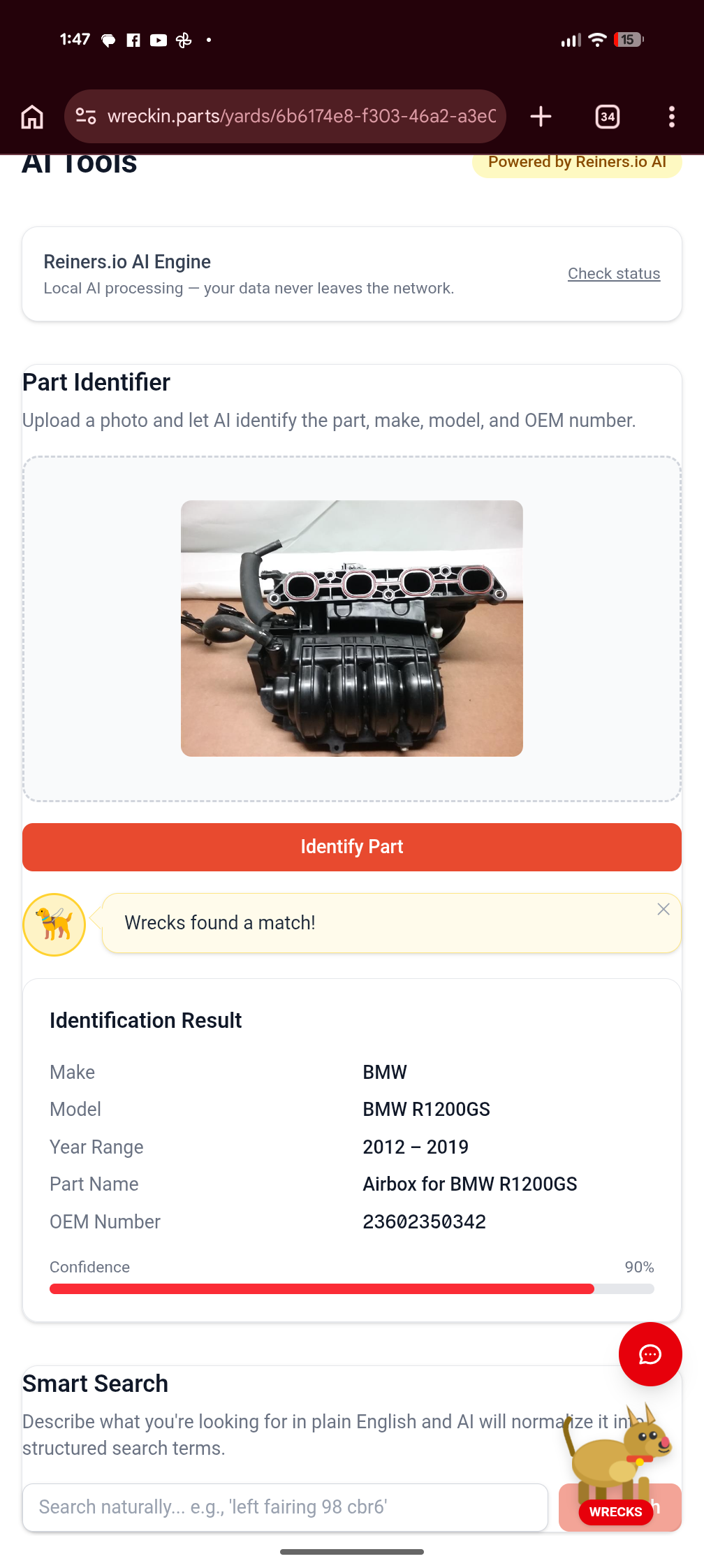 Real result — BMW R1200GS Airbox identified from a phone photo in seconds